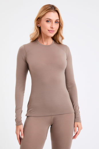 Segunda pele feminina térmica de lã merino ultrafina, criada para regular a temperatura e manter conforto em viagens ou no uso diário.